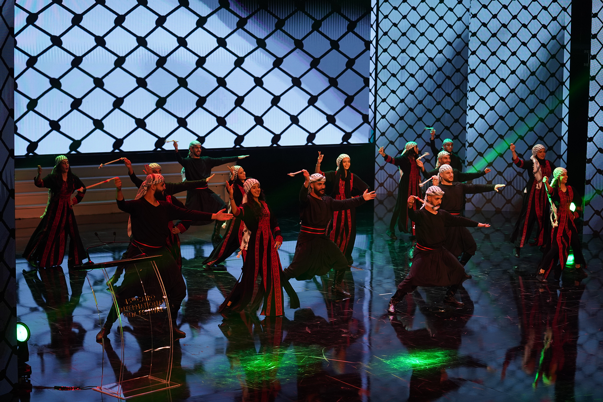 وشاركت في حفل الافتتاح فرقة “وطني الفنون” من غزة بعرض فني يعبر عن الهوية الفلسطينية على أنغام أغنية “أنا دمي فلسطيني”، كما تميزت الساحة بديكورات مستوحاة من الرموز الوطنية، مثل الشال والعلم اللذين ظهرا على الشاشات.