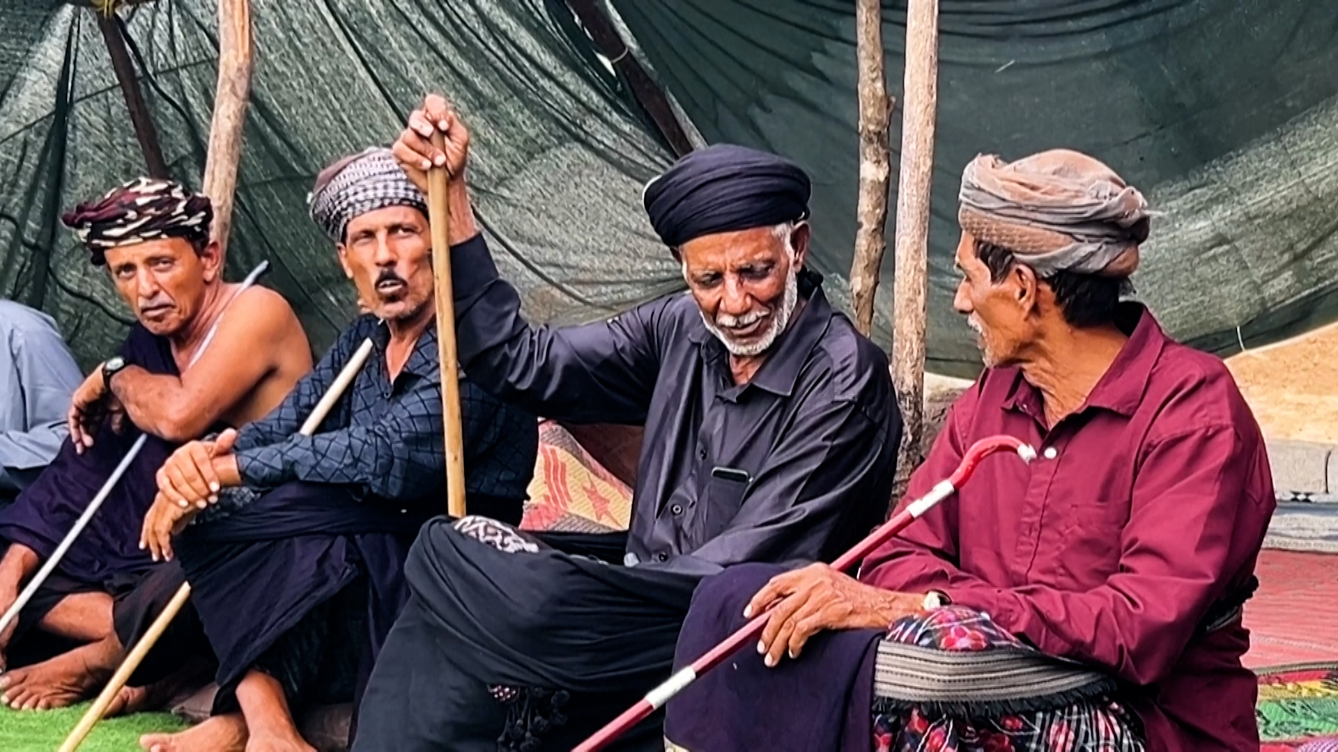 في تجمّع أقيم في صلالة في جنوب سلطنة عمان، يردد رجال بلباسهم التقليدي قصائد قديمة باللغة الجبّالية الشحرية التي لا يفهمها إلا 2% من سكان البلاد ويتمسكون بتوارثها وحمايتها من الاندثار.