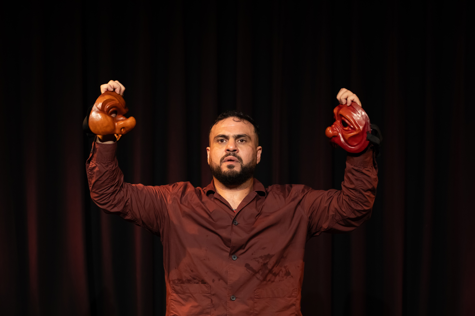 استخدم علاء أقنعته بذكاء لافت، فالقناع هنا غلاف وغطاء يضع بينه وبين الشخصية طبقة عازلة رقيقة تخفف صدمات الذكرى وتفيض بها في الوقت نفسه. صممت الأقنعة بلمحة تهريج مقصودة؛ عينان لامعتان في وجه قاتم، ابتسامة ملتبسة لا تضحك، جسد يتحرك كدمية ماريونت على جسد بشري.