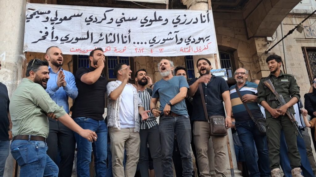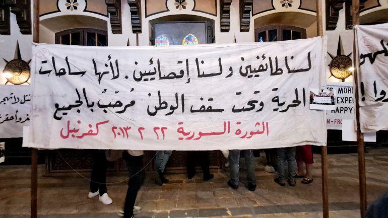 وأما عن اللافتة التي تحمل عبارة “لسنا طائفيين، ولسنا إقصائيين، إنها ساحات الحرية، وتحت سقف الوطن مرحّب بالجميع” فهي -بحسب سلوم- جاءت تأكيدا لمقولة: “إن الثورة لجميع السوريين بغض النظر عن مشاربهم وطوائفهم”.