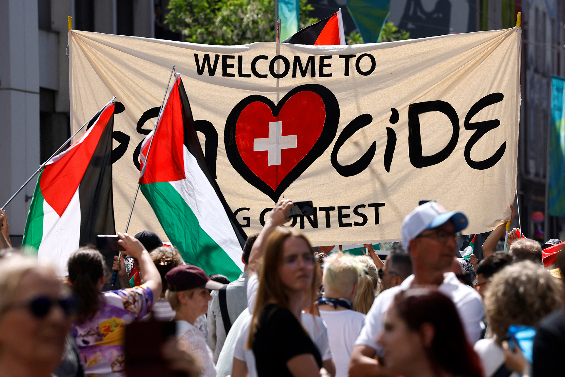 وعند انطلاق الموكب الاحتفالي من أمام مبنى بلدية بازل التاريخي، لوّحت مجموعة من المشاركين بعشرات الأعلام الفلسطينية، ورُفع أحد الأعلام إلى جانب لافتة كتب عليها: “إسرائيل: افتحوا حدود غزة. دعوا المساعدات تدخل”.