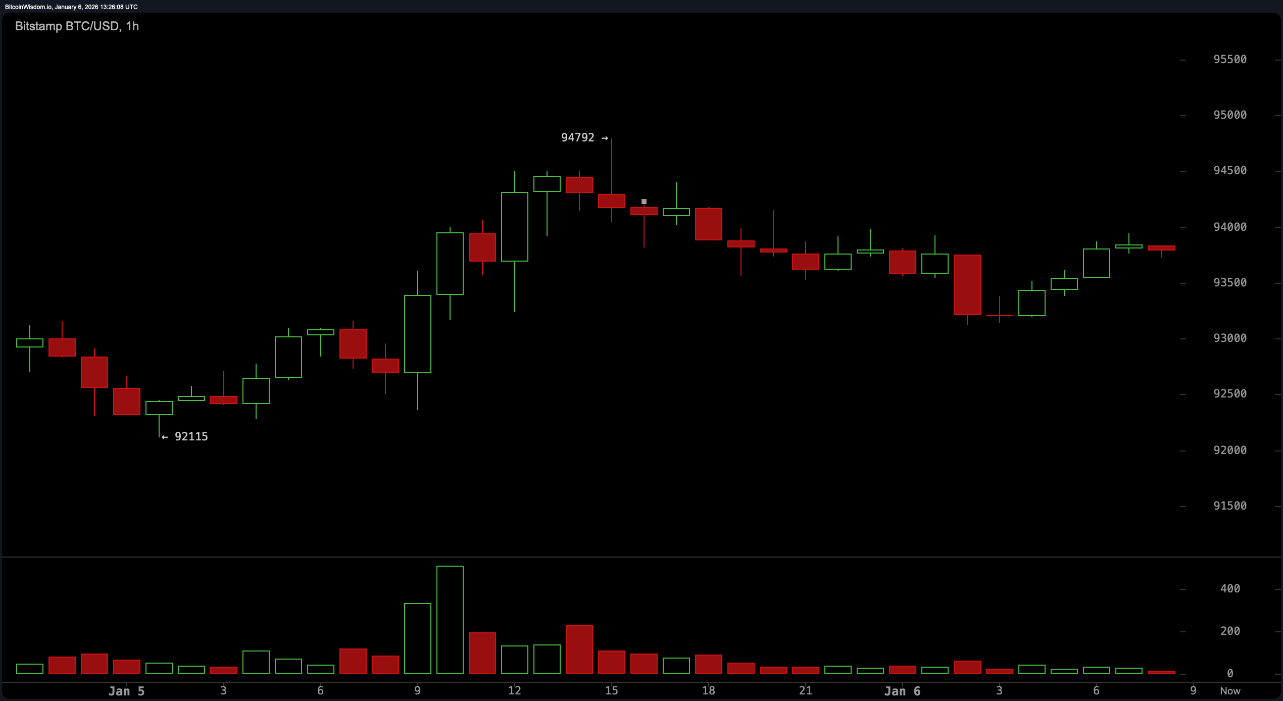 مخطط BTC/USD لمدة ساعة واحدة عبر Bitstamp في 6 يناير 2026.