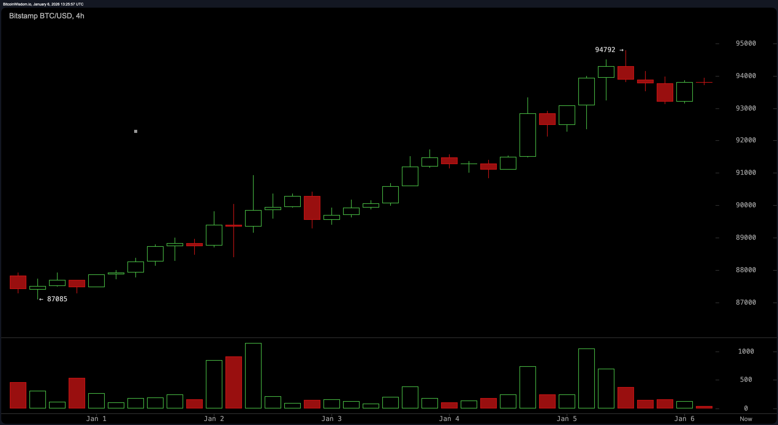 مخطط BTC/USD لمدة 4 ساعات عبر Bitstamp في 6 يناير 2026.