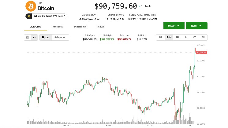 بيتكوين بيتكوين90,657.36 دولار استعاد الذهب مستوى 91000 دولار في ساعات ما بعد الظهيرة الأمريكية المبكرة يوم الجمعة، واستمر في الحركة المتقلبة وهدد بالخروج بشكل مستدام من نطاقه الضيق الذي دام أسبوعًا والذي يتراوح بين 88000 و90000 دولار تقريبًا.
