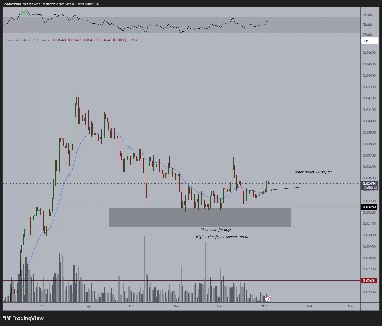 مايكل فان دي بوب: في تحليل أجراه المحلل الشهير فان دي بوب، من المتوقع أن يتفوق أداء ETH على BTC طالما بقي سعر ETH أعلى من المتوسط المتحرك لمدة 21 يومًا على الرسم البياني ETH/BTC.