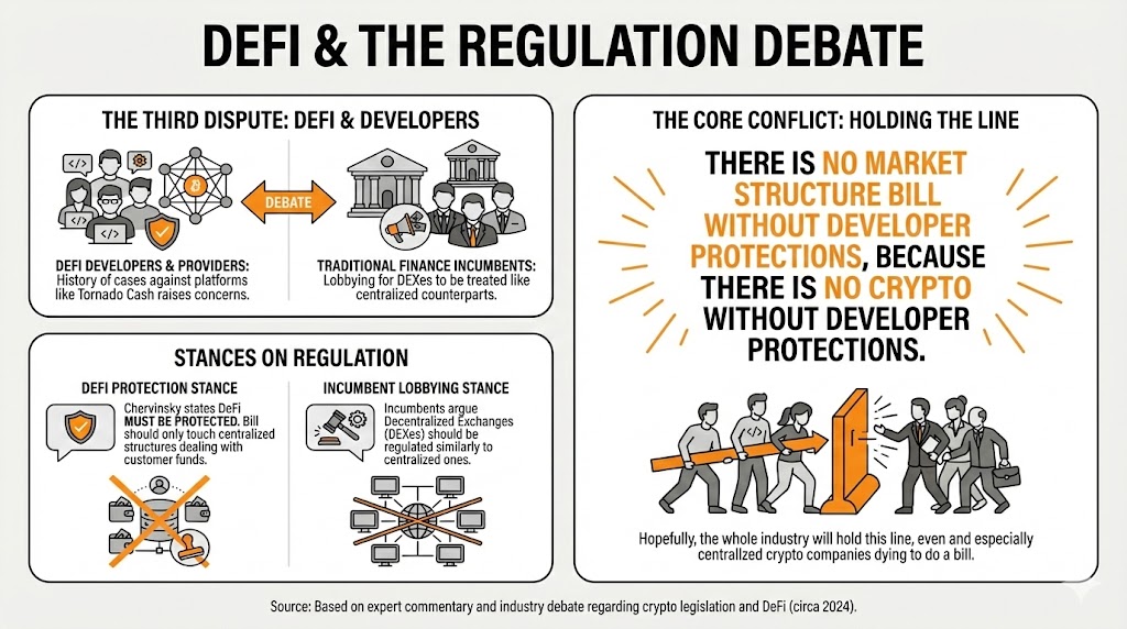 في حين ينص تشيرفينسكي على أنه يجب حماية التمويل اللامركزي، حيث أن مشروع القانون يمس فقط الهياكل المركزية التي تتعامل مع أموال العملاء وتنظيمهم، فإن القائمين على التمويل التقليدي يضغطون من أجل معاملة البورصات اللامركزية (DEXes) على قدم المساواة مع نظيراتها المركزية.