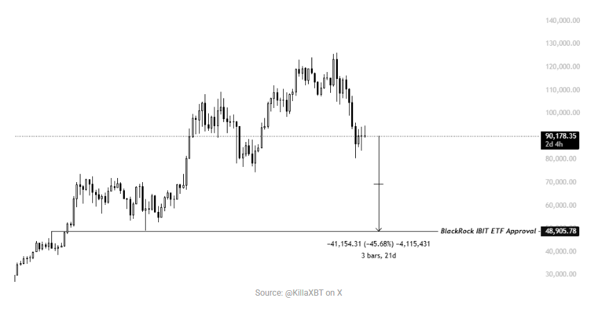 وفي منشور X آخر، تشارك KillaXBT المزيد من التوقعات الهبوطية لسوق البيتكوين. هذه المرة، يتوقع المحلل المتمرس أن تصل الشركة الرائدة في سوق العملات المشفرة إلى أدنى سعر عند 48,905 دولارًا على الرغم من مكاسب الأسعار الأخيرة. يمثل الهدف السفلي لـ KillaXBT سعر Bitcoin اعتبارًا من الموافقة على BlackRock IBIT ETF، إلى جانب 11 صندوق Bitcoin Spot ETFs آخر في يناير 2024. من المحتمل أن يرجع هذا التوقع إلى الأساس المنطقي المشترك المتمثل في أن الاتجاه الصعودي الحالي كان مدعومًا بشكل كبير بالتدفقات المؤسسية.