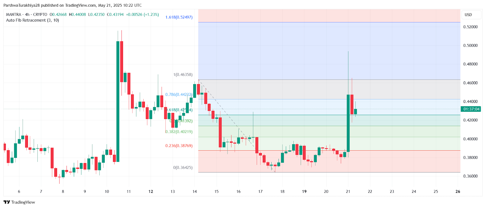 بالإضافة إلى ذلك ، لا تزال Mantra (OM) تتداول ضمن نطاق واسع المغطاة بالمقاومة طويلة الأجل بالقرب من 0.492 دولار ودعم هيكلي أوسع بين 0.35 دولار و 0.38 دولار. يبدو أن إجراء السعر الحالي يختبر الثلث العلوي من نطاق التوحيد هذا.
