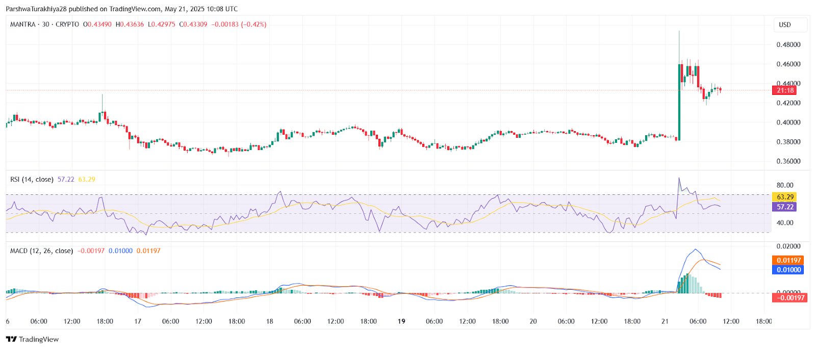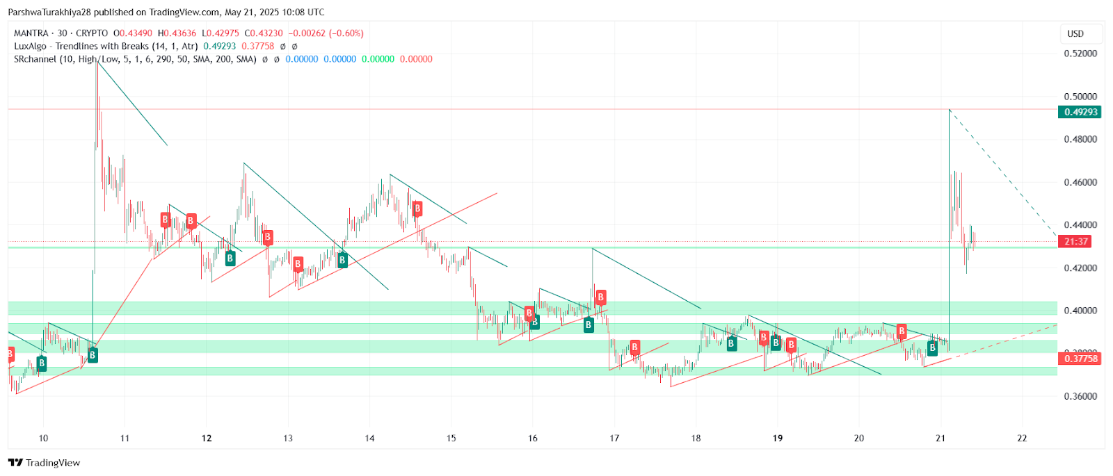 بعد انخفاض حاد في أسابيع ، يتم تداول سعر $ OM اليوم بحوالي 0.433 دولار ، في محاولة لتحقيق الاستقرار أعلى من اندلاع على المدى القصير على المدى القصير. دفعت الزيادة الصعودية المفاجئة في 21 مايو الأسعار من أقل من 0.39 دولار إلى ارتفاع تصل إلى 0.493 دولار ، قبل مكاسب مقلدة الأرباح.