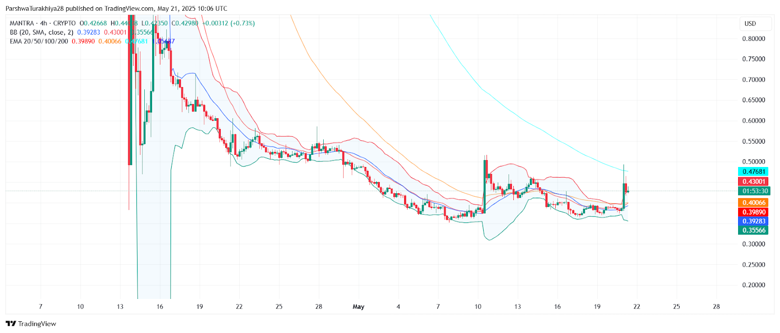 تقلب EMAs على الرسم البياني 4H الصعود ، مع تداول الأسعار أعلى من 20-EMA (0.398 دولار) و 50-EMA (0.400 دولار) ، في حين أن 100-EMA و 200-EMA لا يزال متخلفًا أعلاه. تتوسع نطاقات Bollinger بعد الانتهاء ، حيث يعانق السعر النطاق العلوي – وهو علامة على تقلبات أسعار OM المرتفعة ونقطة قرار وشيكة.
