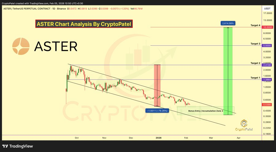وفي الوقت نفسه، يرى باتل احتمالية ارتفاع بنسبة 2600٪ مع أهداف تتراوح بين 5 دولارات و10 دولارات لسعر أستر. قد يشير الإغلاق فوق 0.72 دولار إلى نهاية القناة الهابطة.