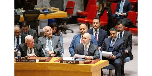 تجدد الكويت ومن هذا المنبر تأكيدها على موقفها الثابت والراسخ والتاريخي الداعم للحق الفلسطيني، وتشدد على أن السبب الرئيسي للصراع هو وجود احتلال لا آفاق لنهايته. وإذا أردنا سلاما وأمنا مستدامين يجب أن تحل القضية وفقا للمرجعيات المتفق عليها وقرارات الشرعية الدولية لاسيما قرارات مجلس الأمن ذات الصلة ومبادرة السلام العربية لعام 2002 بما يضمن حصول الشعب الفلسطيني الشقيق على كامل حقوقه السياسية المشروعة وحقه في تقرير المصير وإقامة الدولة الفلسطينية المستقلة ذات السيادة وعاصمتها القدس الشرقية على حدود الرابع من يونيو للعام 1967.