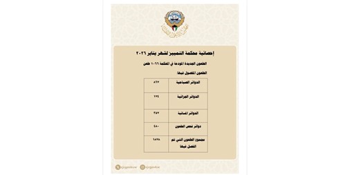 أعلنت محكمة التمييز إحصائية شهر يناير 2026 حيث بلغت الطعون الجديدة المودعة في المحكمة 1066طعنا فيما بلغ اجمالي عدد الطعون المفصول فيها 1878طعنا خلال الشهر الماضي.