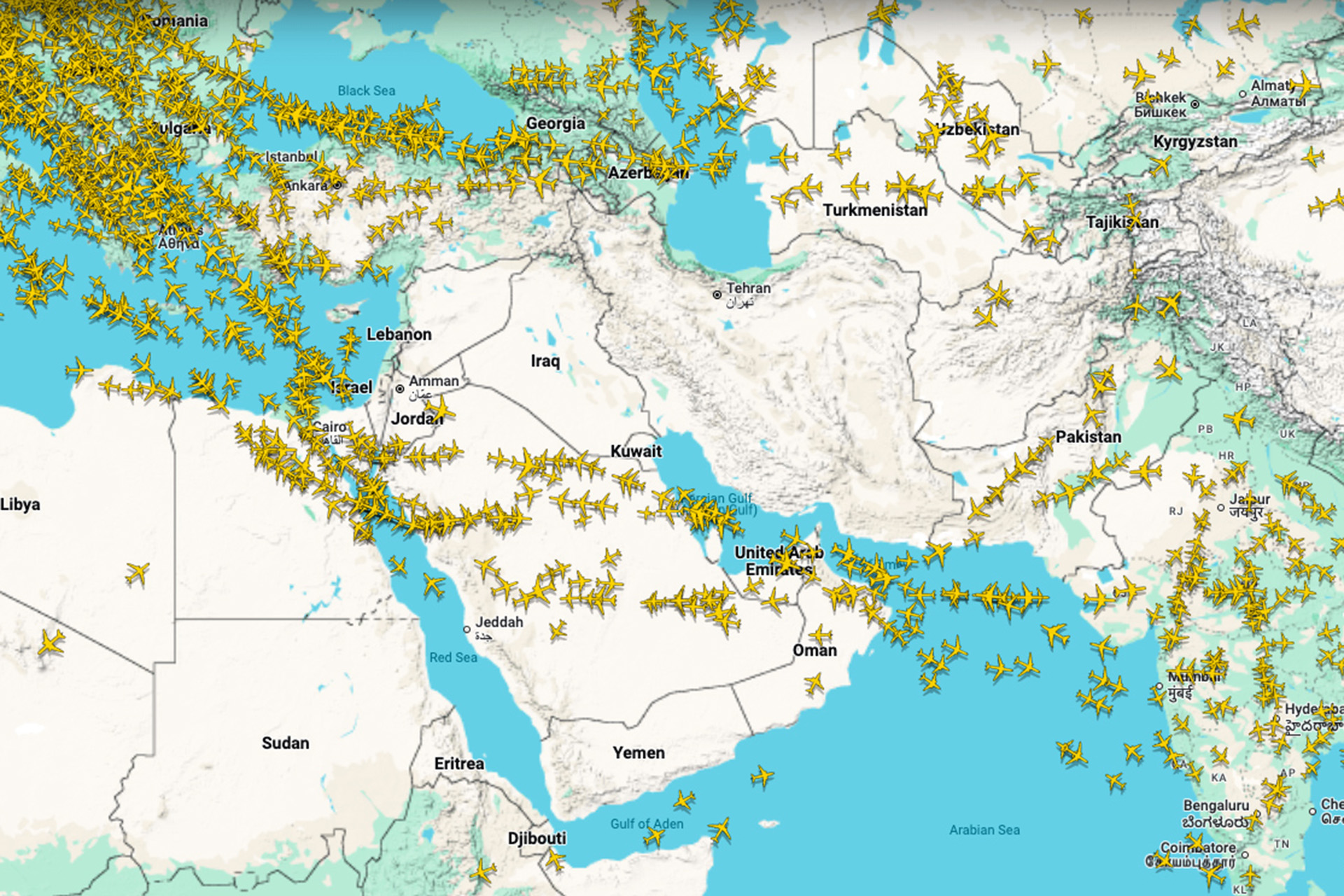 وبحسب بيانات من موقع تتبع الرحلات الجوية “فلايت رادار24” (FlightRadar24) كان التجنب المستمر لهذه الممرات الجوية الرئيسية واضحا اليوم.