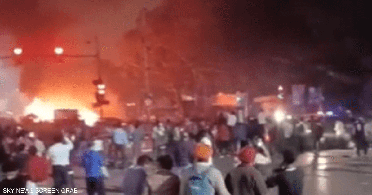 وفي مقاطع فيديو متداولة يمكن رؤية نيران ضخمة وسط تجمع العشرات.