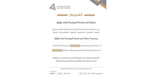 في السياق ذاته، أعلن ديوان الخدمة المدنية رسميا في بيان على حسابه على تطبيق «اكس»، أن عطلة السنة الميلادية 2026 ستكون الخميس الموافق 1 يناير ويستأنف الدوام 4 من الشهر ذاته.