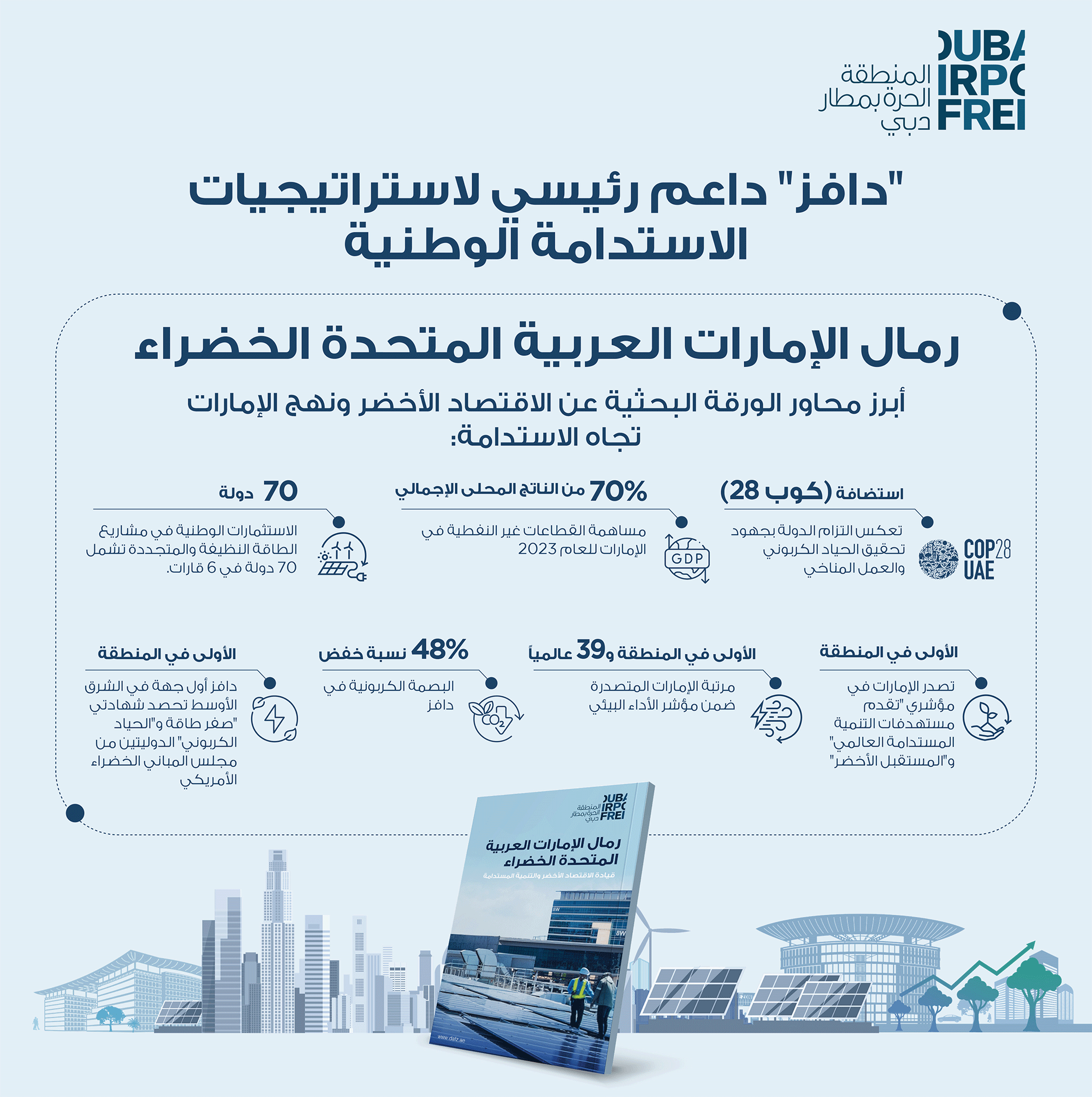 أصدرت المنطقة الحرة بمطار دبي “دافز”، التابعة لسُلطة دبي للمناطق الاقتصادية المتكاملة “دييز”، ورقة بحثية كشفت فيها عن نهجها المستدام الذي نجح بتعزيز موقعها كلاعب رئيسي داعم للاستراتيجيات الوطنية ذات الصلة بالممارسات البيئية والاجتماعية وحوكمة الشركات، ومستوى التقدم الكبير الذي حققته دولة الإمارات في هذا المجال بالاستناد إلى رؤى متعمقة وإحصائيات ودراسات شاملة.