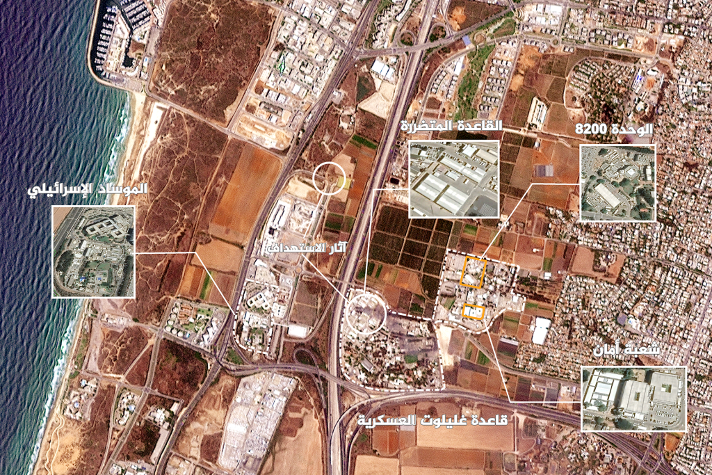 أظهرت صور أقمار صناعية آثار سقوط عدد من الصواريخ الإيرانية داخل قاعدة تدريب تابعة لجهاز الاستخبارات العسكرية الإسرائيلية (أمان)، وذلك ضمن نطاق قاعدة غليلوت ومحيط مقر الموساد في منطقة رامات هشارون بتل أبيب.