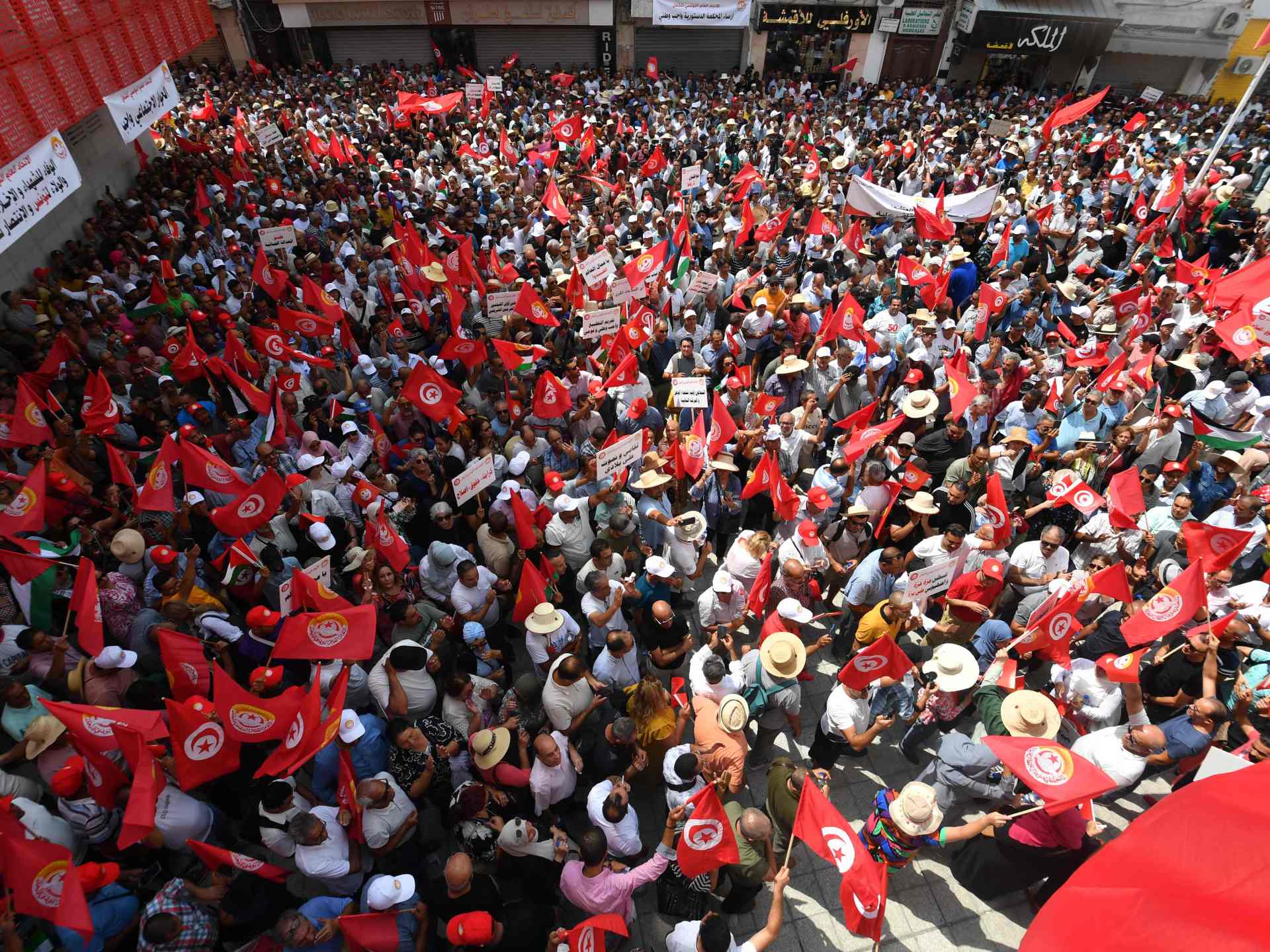وقال الأمين العام للاتحاد النقابي نور الدين الطبوبي، في كلمة له أمام المتظاهرين الذين احتشدوا أمام مقر المنظمة النقابية، إن البلاد تمر بـ”مرحلة حساسة”، مشيرا إلى انهيار أسس الحياة السياسية والمدنية، ومُبديا أسفه على ما وصفه بـ”المعلومات الخاطئة” و”التحريض الممنهج” ضد الاتحاد الحاصل على جائزة نوبل للسلام عام 2015.