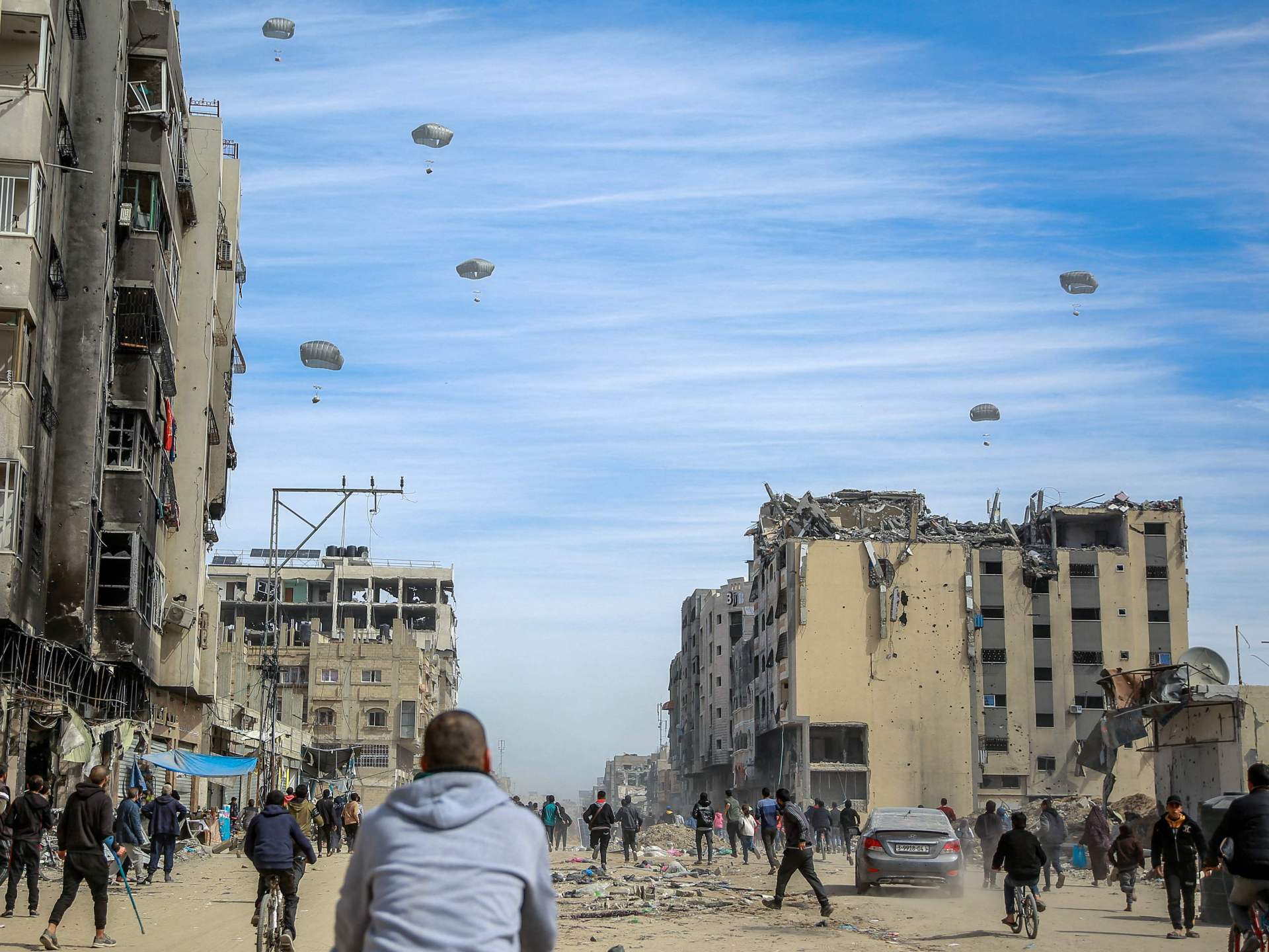 وأكدت مصادر فلسطينية بدء إنزال المساعدات على شمال غزة.