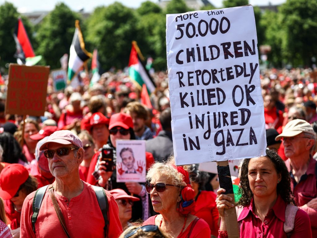 تجمع عشرات الآلاف من المتظاهرين ومنهم عائلات مع أطفالها في هولندا، اليوم الأحد، للاحتجاج على حرب الإبادة والتجويع الإسرائيلية بحق الفلسطينيين في قطاع غزة وسياسة الحكومة الهولندية تجاه الحرب.