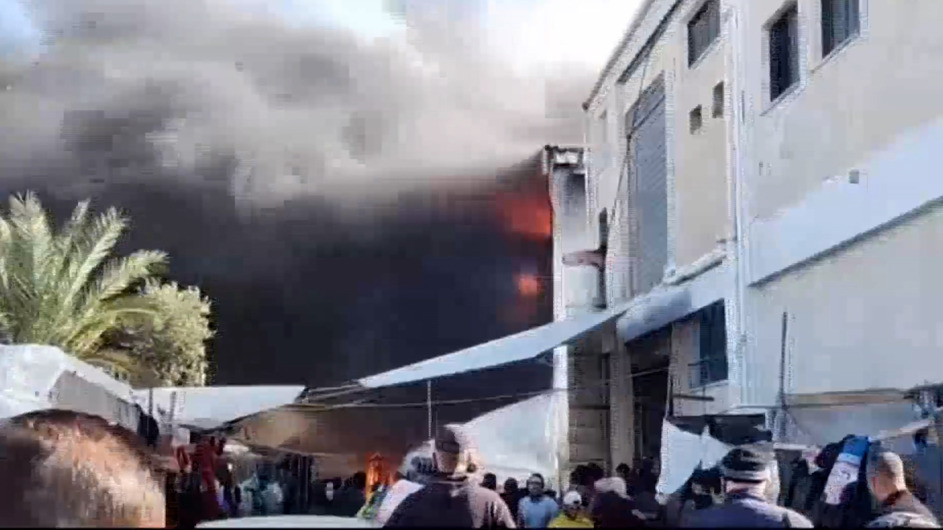 حصلت قناة الجزيرة على صور خاصة لحريق طال مركزا يؤوي 10 آلاف نازح في خان يونس جنوبي قطاع غزة، بعد تعرضه لقصف إسرائيلي. وظهر دخان كثيف يخرج من المركز ، بينما النيران تلتهم المكان من الداخل.