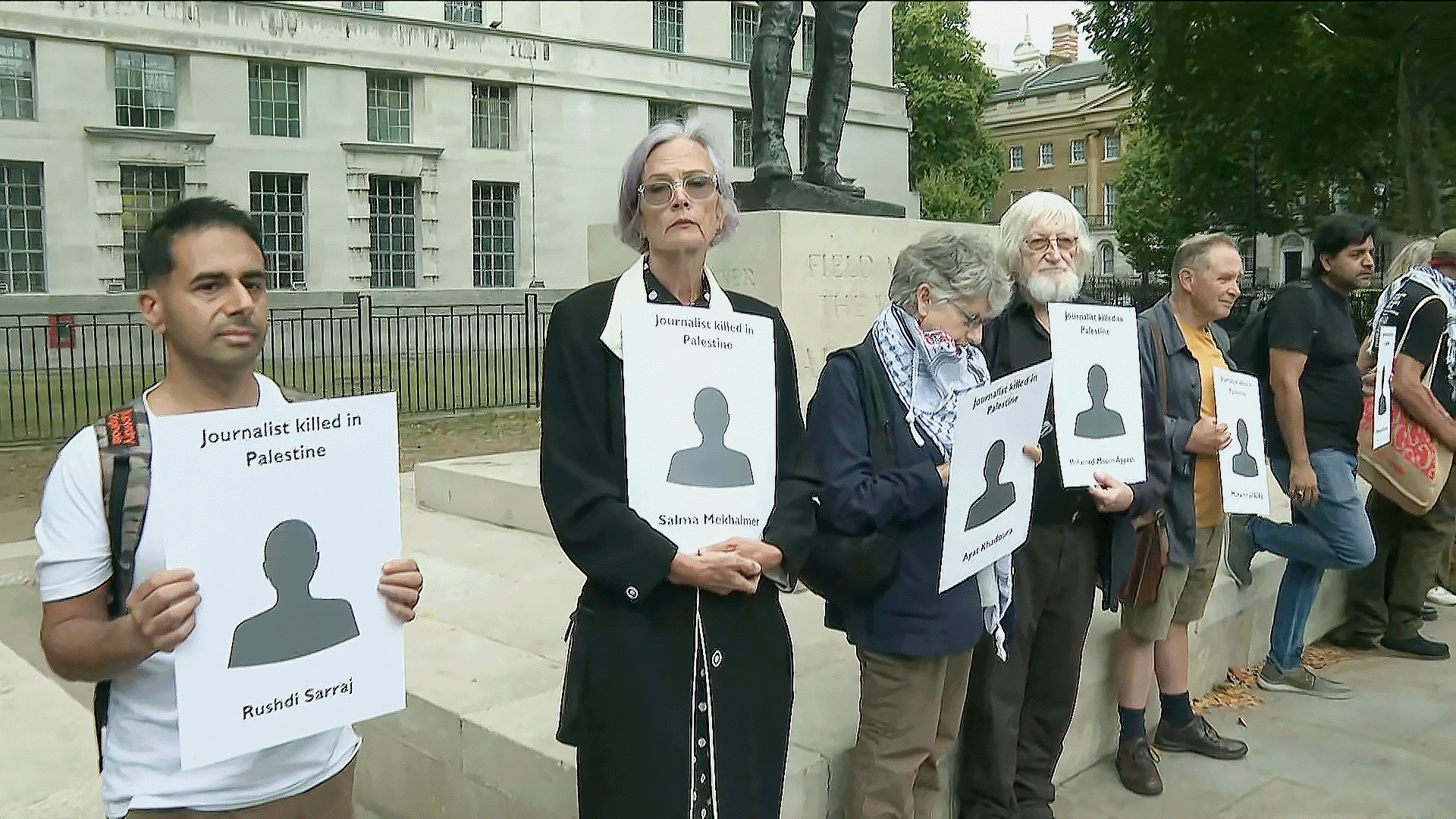 نظم ناشطون من الاتحاد الوطني للصحفيين مظاهرة أمام مقر الحكومة البريطانية في العاصمة لندن للمطالبة بوقف حرب الإبادة الإسرائيلية على قطاع غزة ووقف استهداف الصحفيين.