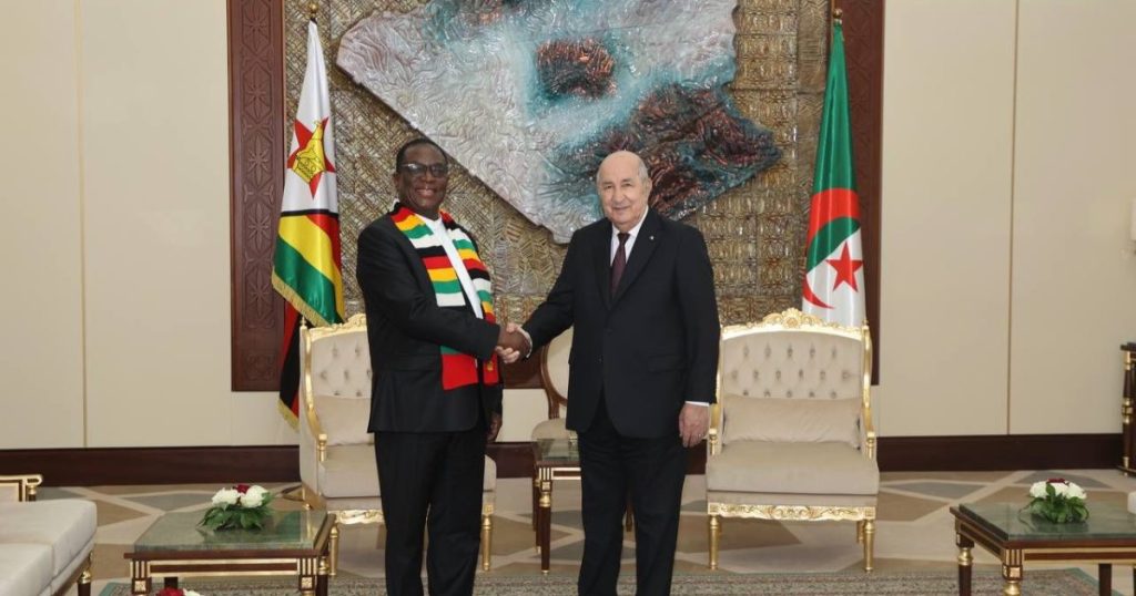 وقال الرئيس الجزائري عبد المجيد تبون إن زيارة نظيره إمرسون تعكس الإرادة السياسية المشتركة لتطوير العلاقات التي توجت في ختام الدورة الرابعة للجنة الجزائرية الزيمبابوية المشتركة، بتوقيع اتفاقيات تعاون ومذكرات تفاهم في المجالات الحيوية المتعددة.