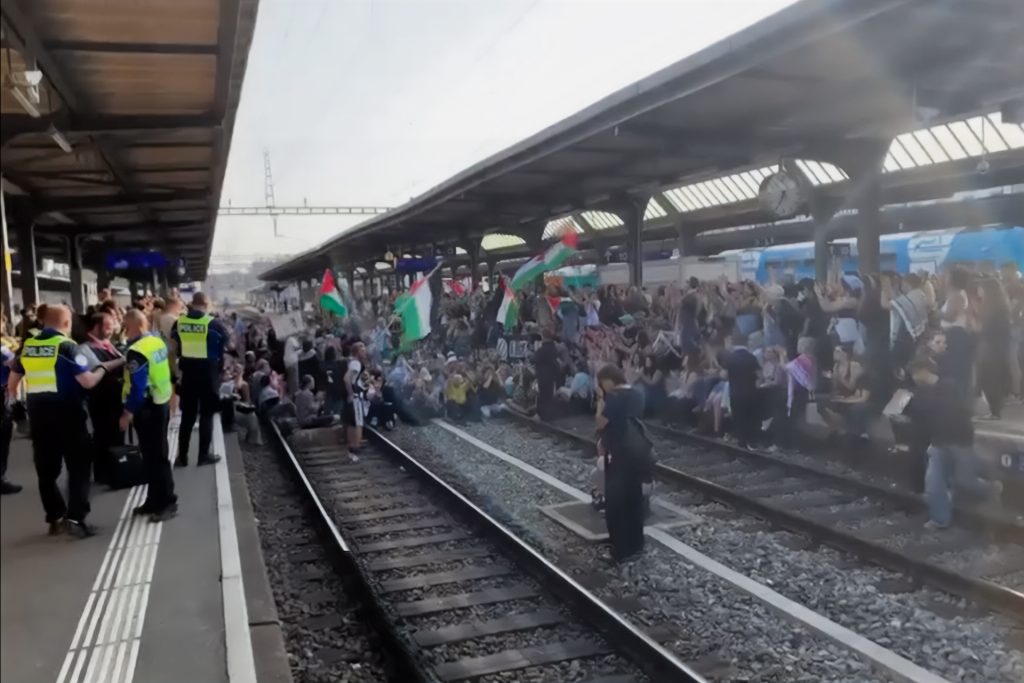 وقالت صحيفة “لا تريبون دو جنيف” إن حوالي 300 متظاهر اعتلوا مسارات القطارات في محطة جنيف عصر الإثنين، وهم يرفعون الأعلام الفلسطينية، مما تسبب في وقف حركة القطارات على رصيفين رئيسيين في المحطة لمدة نحو ساعة.