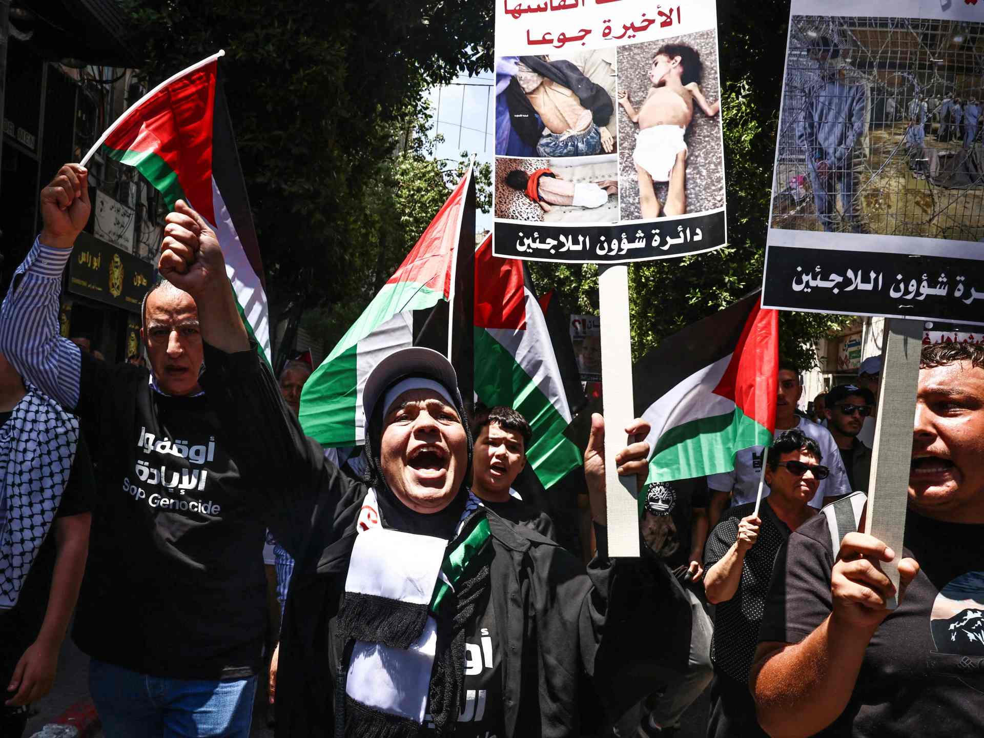 ورفع المتظاهرون -في وقفة احتجاجية مدينة الخليل- شعارات تطالب بوقف حرب الإبادة الجماعية وجرائم التجويع في غزة، وحملات الاستيطان والتهجير الإسرائيلي بالضفة المحتلة.