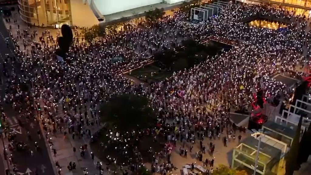 ووثقت مشاهد مصورة جموع المحتجين في ساحة هبيما في تل أبيب، في مظاهرتهم المطالبة بإنهاء الحرب وإعادة المحتجزين من قطاع غزة.