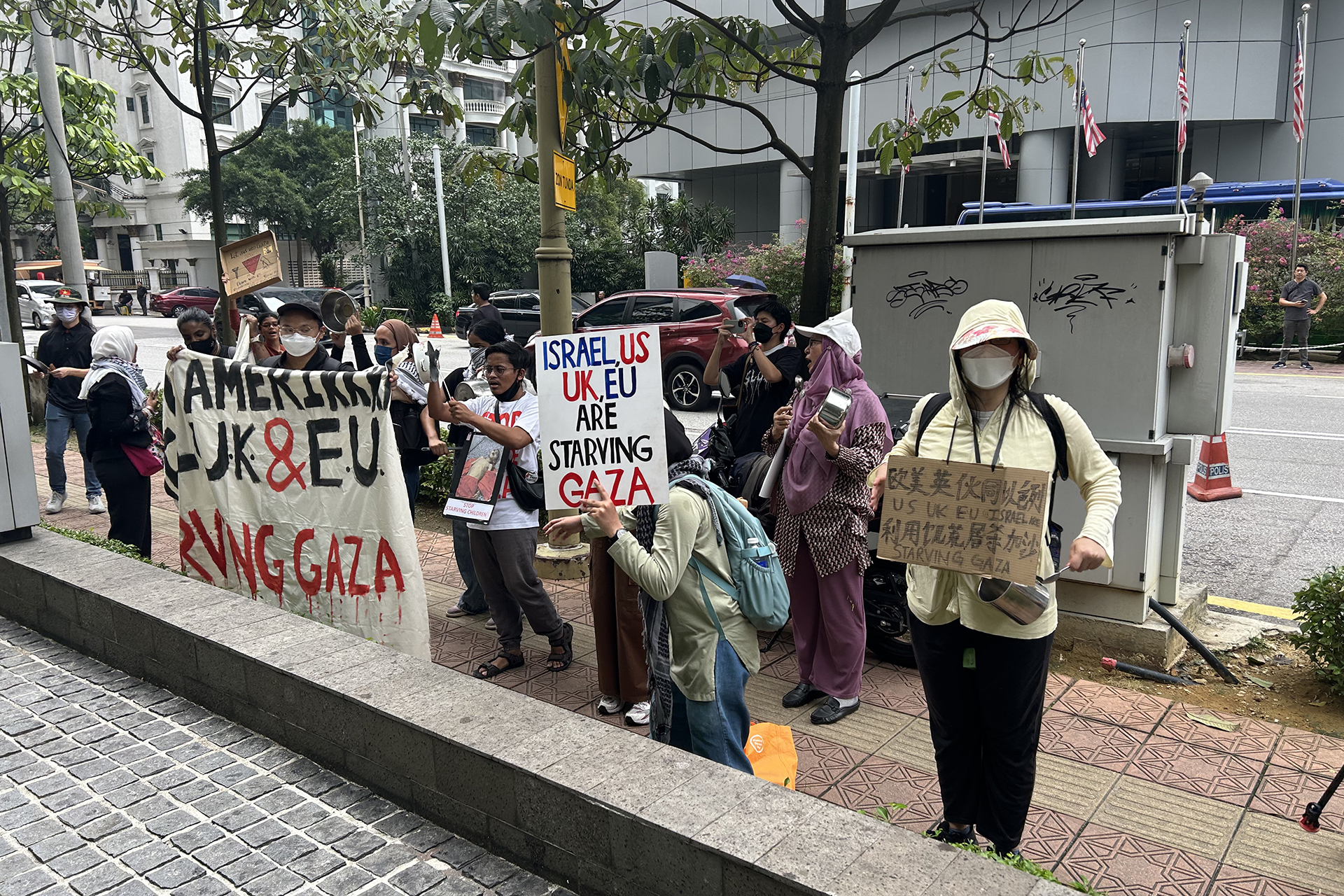 تظاهر ناشطون ماليزيون، اليوم الأربعاء، أمام السفارتين الأميركية والبريطانية في العاصمة الماليزية كوالالمبور، واتهموا القوى الغربية بالمشاركة في جرائم الحرب التي ترتكبها قوات الاحتلال الإسرائيلي ضد الشعب الفلسطيني.