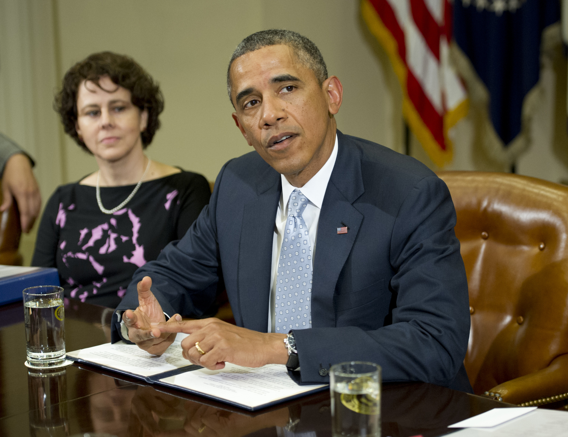 يتحدث الرئيس باراك أوباما، إلى اليمين، مع مديرة مجلس السياسة المحلية سيسيليا مونيوز، إلى الصحافة قبل اجتماعه مع الرؤساء التنفيذيين حول إصلاح الهجرة في 24 يونيو/حزيران 2013 في واشنطن العاصمة. (رون ساكس / غيتي إيماجز)