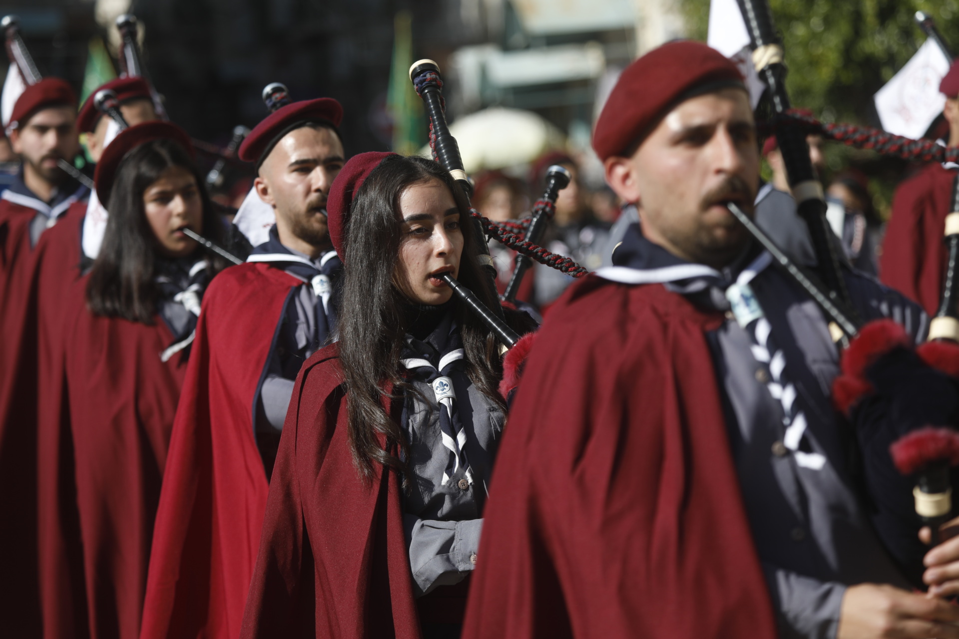 تمثل الكشافة المدن والبلدات في جميع أنحاء الضفة الغربية، مع الأعلام الفلسطينية والطرطان ملفوفة على مزمار القربة. وعلى مدى العامين الماضيين، كان الكشافة يسيرون بصمت احتجاجًا على الحرب.