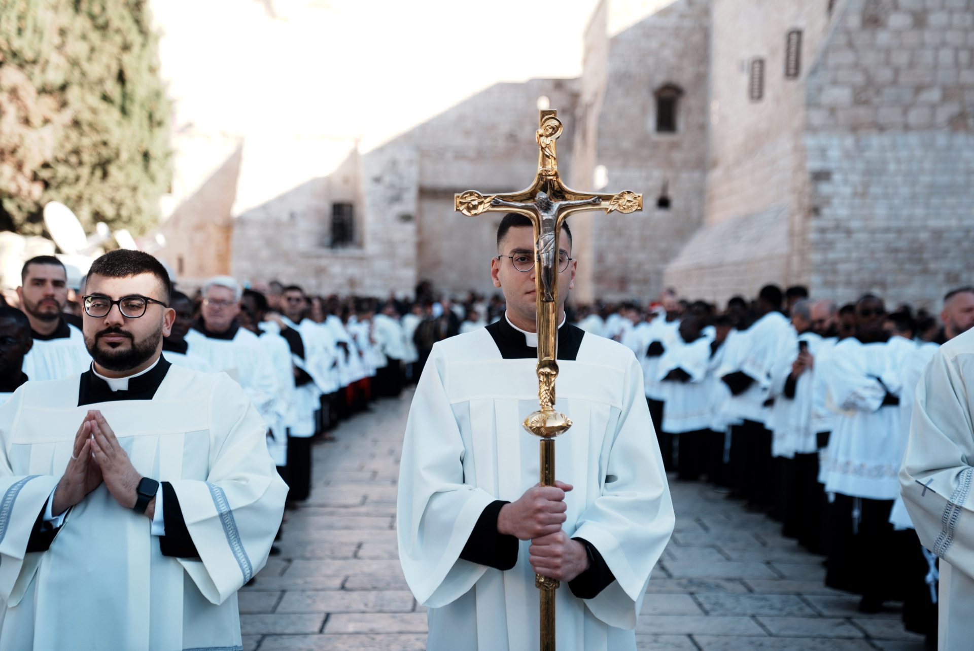 رجال الدين الكاثوليك ينضمون إلى بطريرك القدس اللاتيني الكاردينال بييرباتيستا بيتسابالا في موكب إلى كنيسة المهد، حيث ولد يسوع، في بيت لحم عشية عيد الميلاد، 24 ديسمبر 2025. (عصام الريماوي / الأناضول عبر غيتي إيماجز)