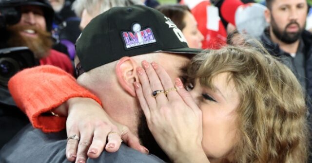 التقطت الكاميرات نجمة البوب تايلور سويفت وهي تعطي قبلة لصديقها ترافيس كيلسي على أرض الملعب بعد أن ضمن فريق كانساس سيتي تشيفز مكانه في مباراة السوبر بول.