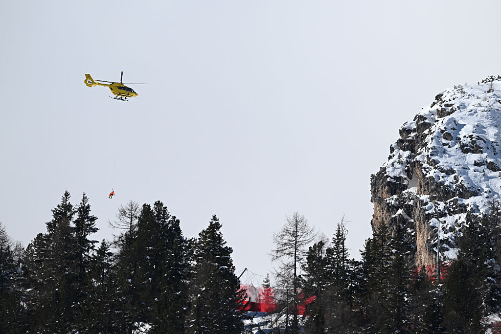 شوهدت طائرة هليكوبتر إنقاذ تحلق إلى ليندسي فون من فريق الولايات المتحدة بعد تحطمها أثناء انحدار السيدات في اليوم الثاني من دورة الألعاب الأولمبية الشتوية ميلانو كورتينا 2026 في مركز توفان للتزلج على جبال الألب في 08 فبراير 2026 في كورتينا دامبيزو، إيطاليا. (ماتيا أوزبوت / جيتي)