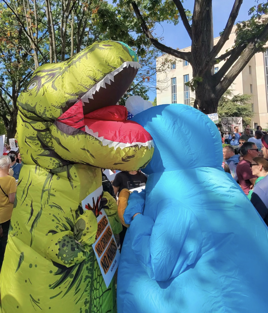 يعد استخدام أزياء الحيوانات القابلة للنفخ اتجاهًا حديثًا لدى النشطاء والذي بدأ كرد فعل على ملاحقة إدارة ترامب لليساريين العنيفين، بهدف مواجهة رواية أعمال الشغب العنيفة من خلال محاولة الظهور على أنها غير ضارة قدر الإمكان. وبطبيعة الحال، كما هو الحال مع معظم الاستراتيجيات التي يستخدمها الناشطون اليساريون، فإن الأمر ينتهي بجعلها تبدو غريبة ومخيفة، ويبدو أن الخطاب العنيف يظل على قيد الحياة على اللافتات دون معارضة على الرغم من نوايا المنظمين المنطوقة.