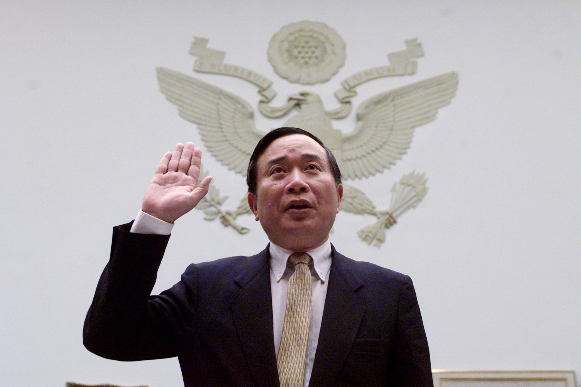 أدى جون هوانغ، جامع التبرعات للحزب الديمقراطي، اليمين الدستورية بينما يبدأ أربعة أيام من الإدلاء بشهادته أمام لجنة الشؤون الحكومية بمجلس النواب للنظر في مخالفات تمويل الحملات الانتخابية. (هاري هامبورغ / أرشيف أخبار نيويورك اليومية عبر Getty Images)