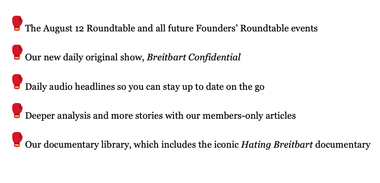لم يفت الأوان بعد للانضمام إلى نادي القتال وتصبح عضوًا مؤسسًا ، مما يمنحك الوصول إلى هذه الأحداث المائدة المستقبلية لجميع المؤسسين المستقبليين. تحتاج فقط إلى الانضمام كعضو سنوي على مستوى “الوزن المتوسط” أو أعلى بواسطة منتصف الليل يوم الأحد 10 أغسطس. بعد الانضمام ، ستتلقى بريدًا إلكترونيًا مباشرة من Breitbart News حتى تتمكن من التسجيل لحدث 12 أغسطس.