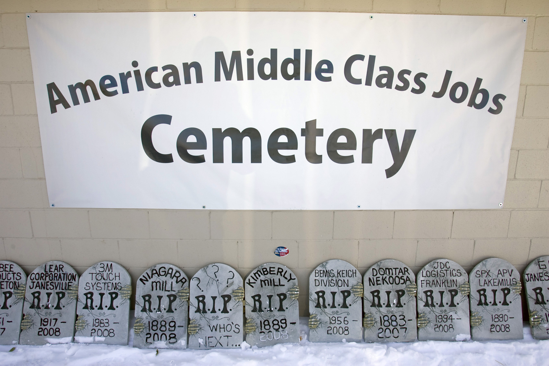 حجارة القبور التي تحمل أسماء المصانع المحلية المغلقة تقع على الجانب الآخر من الشارع من مصنع الورق المغلق NewPage في كيمبرلي، ويسكونسن، في 11 ديسمبر 2008. (مات لودتكي / بلومبرج عبر غيتي إيماجز)
