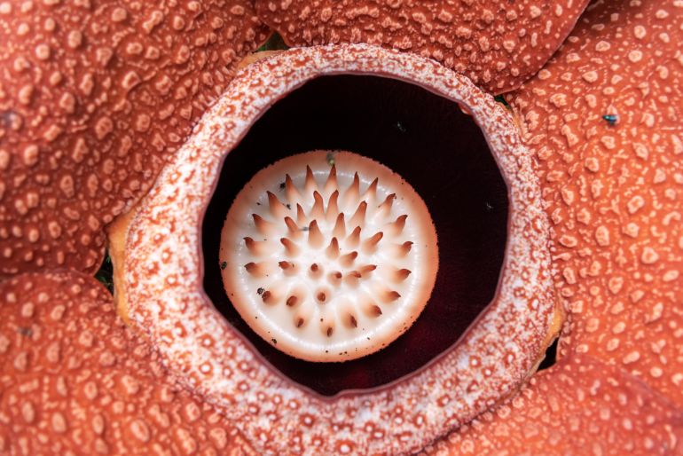 إنها زهرة رافليسيا أرنولدي، المعروفة باسم “زهرة الجثة”، وتُسمى أحيانا “زهرة الوحش”، وهي نبات طفيلي عملاق حيّر العلماء منذ اكتشافه، يستغرق نموه من البذرة إلى الزهرة سنوات، ويقضي معظم حياته الطويلة مختبئا في أرض الغابة، وعندما ينضج أخيرا ينفجر ليصبح أكبر زهرة في العالم.