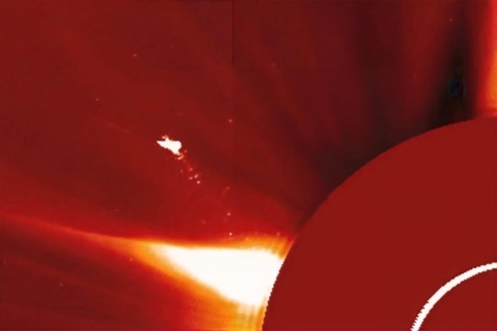 في الصور الملتقطة من مرصد الشمس وغلافها، تظهر الشمس مغطاة تماما بأداة تسمى الإكليلوغراف، وهي مصممة خصيصا لحجب قرص الشمس الساطع حتى يتمكن العلماء من رؤية الهالة الشمسية، وهي الطبقة الخارجية من الغلاف الجوي للشمس.