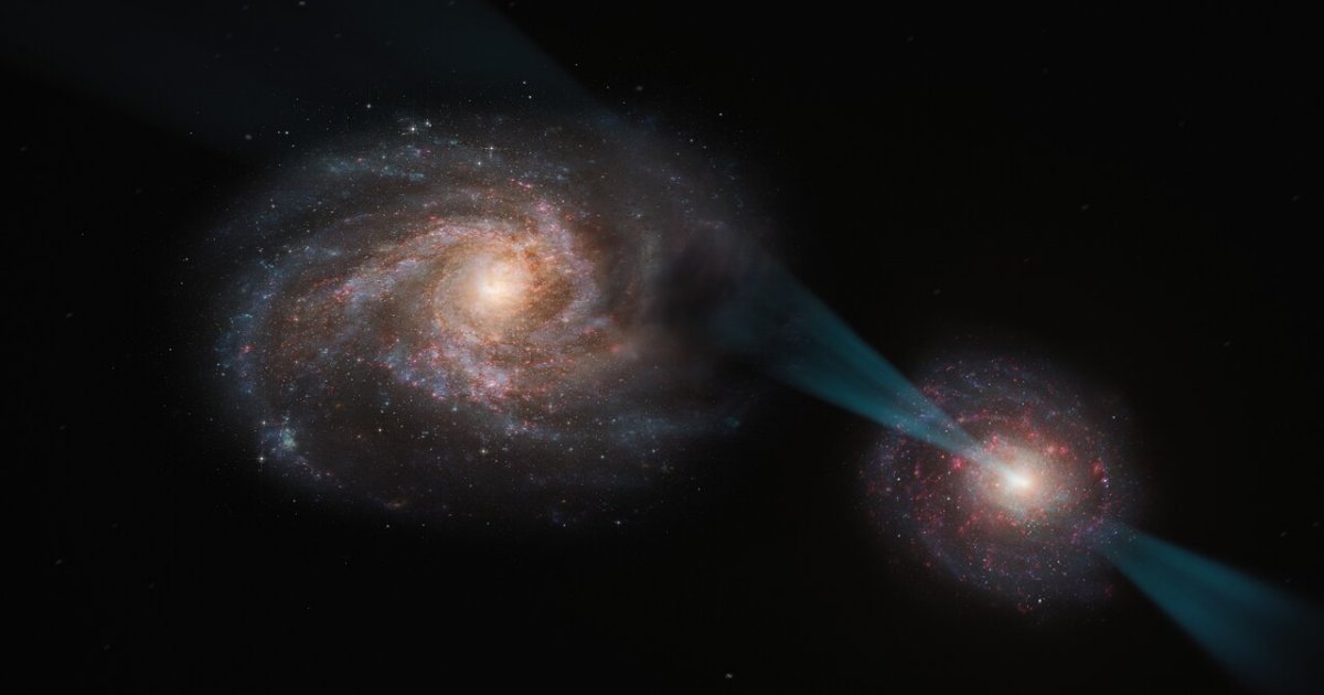مع الفارق، فإن هذا ما حدث لكن على نطاق كوني، حيث رصد فريق دولي من علماء الفلك في دراسة نشرتها دورية نيتشر مجرتين تتقاربان بسرعات خيالية تبلغ 500 كيلومتر في الثانية، وفي أثناء ذلك تضرب إحداهما الأخرى بشعاع كثيف، وهو ما دفع العلماء إلى تسمية هذا المشهد بـ”المبارزة الكونية”.