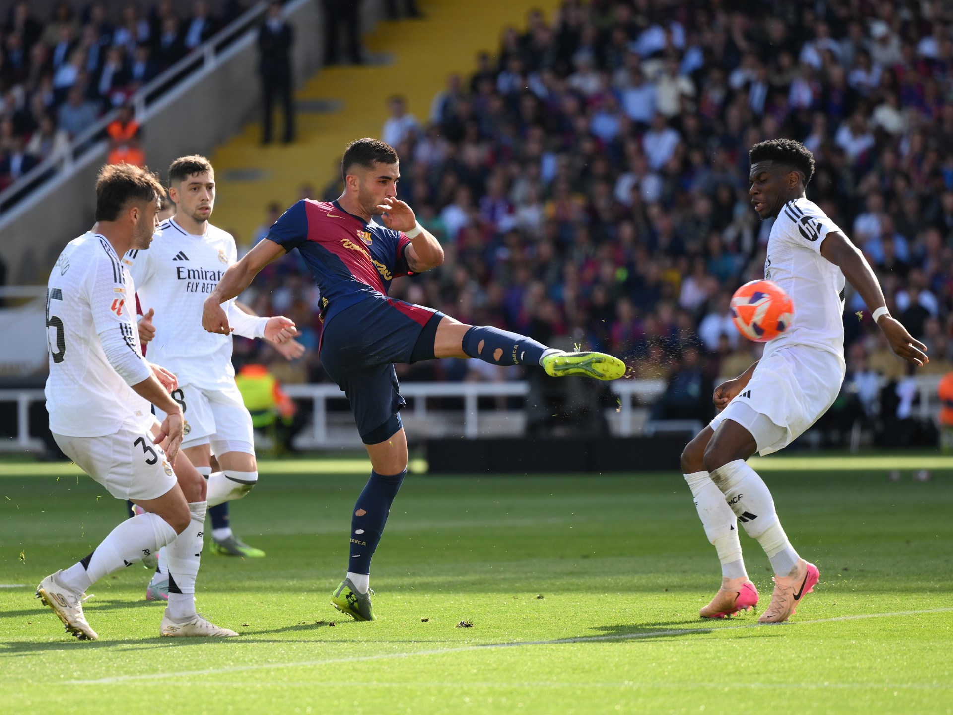 👉🏻 Tchouameni, con el brazo abierto y sin hacer por retirarlo, detiene un remate a bocajarro de Ferrán Torres.
