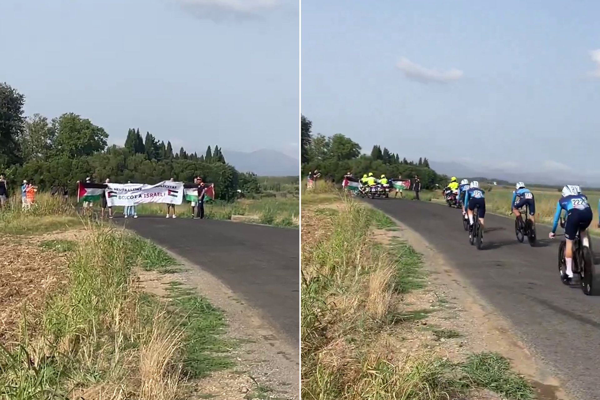 Protesta en favor de Palestina en la #VueltaRTVE27a al paso del equipo @IsraelPremTech en la crono por equipos de 24 kilómetros en Figueres.