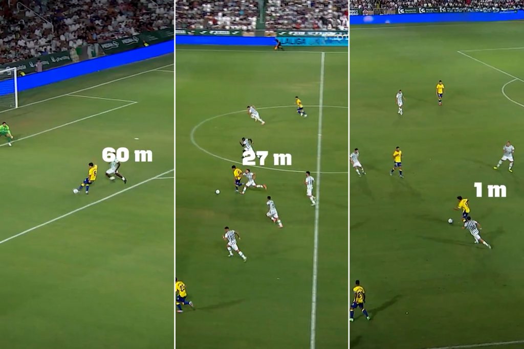 واستلم كليمنتي (26 عاما) الكرة على الجهة اليسرى وانطلق بها متجاوزا لاعبين من قرطبة، ثم تخطى الثالث وانطلق بسرعة كبيرة مخترقا الدفاع، وبعدما قطع مسافة 60 مترا في 6 ثوان وجد نفسه وجها لوجه مع كارلوس مارين حارس مرمى الفريق المحلي، قبل أن يسدّد كرة قوية متقنة في الزاوية البعيدة.