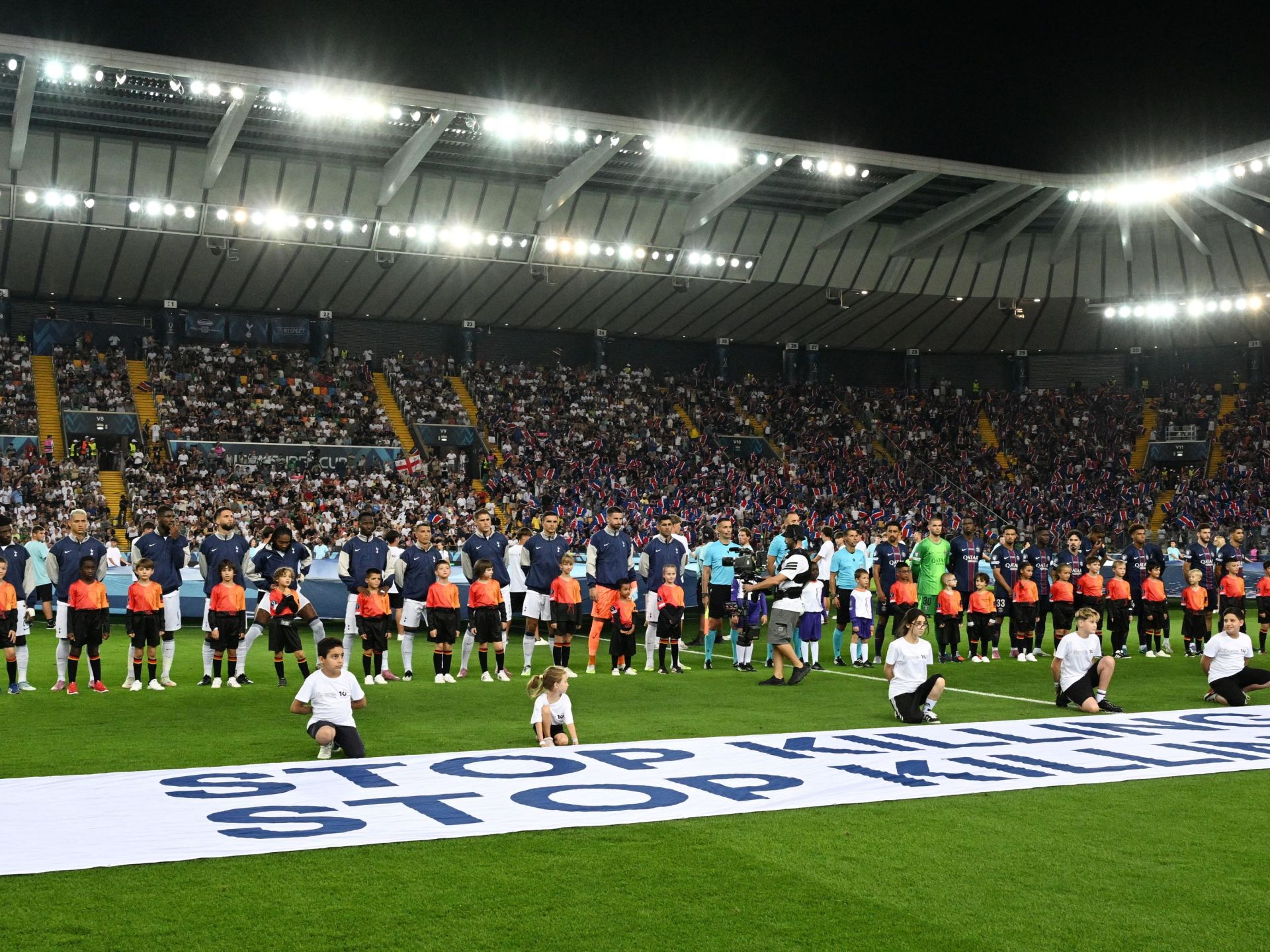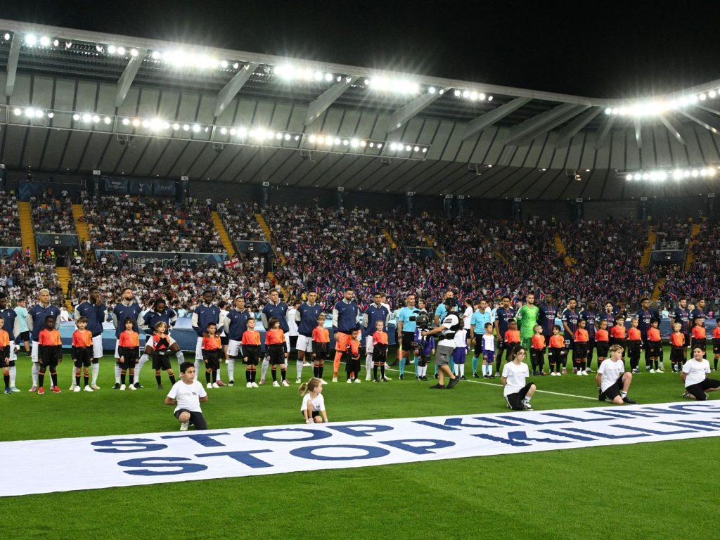 وبالإضافة إلى ذلك، حمل 9 أطفال لاجئين من أفغانستان والعراق ونيجيريا وفلسطين وأوكرانيا لافتة قبل المباراة كتب عليها “أوقفوا قتل الأطفال، أوقفوا قتل المدنيين”.