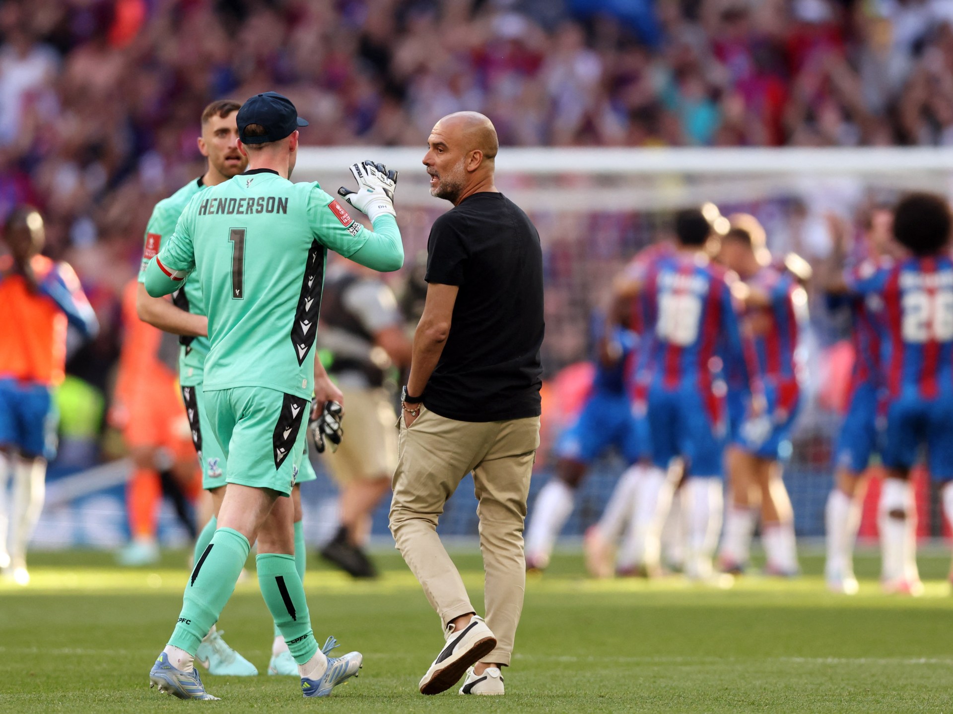 دخل الإسباني بيب غوارديولا مدرب مانشستر سيتي في مشادة حادة مع دين هندرسون حارس مرمى كريستال بالاس بعد نهاية مباراة الفريقين في نهائي كأس الاتحاد الإنجليزي.