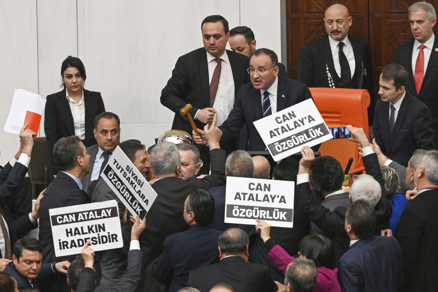 أثار القرار، الذي قرأه نائب رئيس البرلمان، بكير بوزداغ، يوم الثلاثاء 30 يناير/كانون الثاني، من مقعده على الدراجة الهوائية، حركة احتجاجية واسعة النطاق، حيث هرع العشرات من النواب إلى المكتب. وتحت صيحات الاستهجان من المعارضة، لوح العديد من المسؤولين المنتخبين بلافتات تدعو إلى ذلك “تحرير جان أتالاي”. حتى أنه تم إلقاء نسخة صغيرة من الدستور على نائب الرئيس قبل أن يختتم الجلسة.